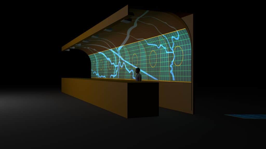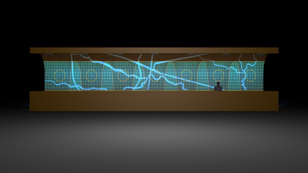 The custom video content was designed specifically to highlight the contours of the copper riverscape. We created original animations that followed the natural flow of the river system, enhancing the artwork rather than overpowering it. The light moves gently across the metal surface, tracing each bend and curve. The effect is subtle but captivating, offering a sense of motion and calm that welcomes guests the moment they step inside.