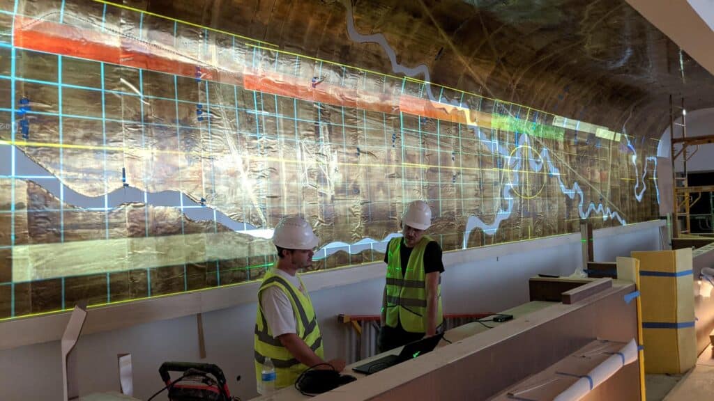 We engineered a seven-projector array, carefully blended to cover the entire copper wall above the reception desk. Each projector was positioned to match the dimensions and curves of the wall without distorting the artwork or spilling light where it wasn’t needed. The result was a seamless visual experience, perfectly integrated with the space.